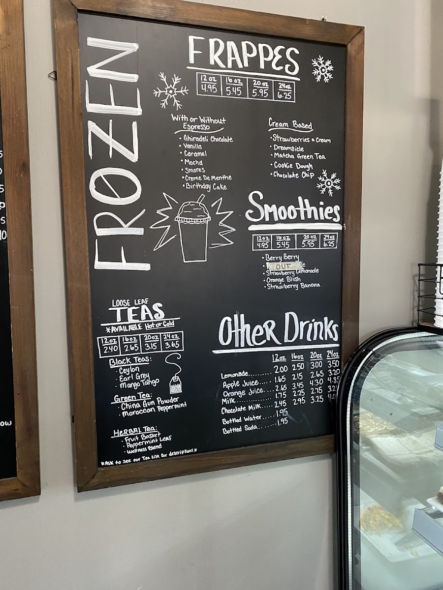 Customizable frappe with options for size (12-24 oz), chocolate or vanilla base. Choose from 8 flavors, including chocolate and strawberry matcha. Options for espresso or cream base, with or without whipped cream. Chocolate chips available.